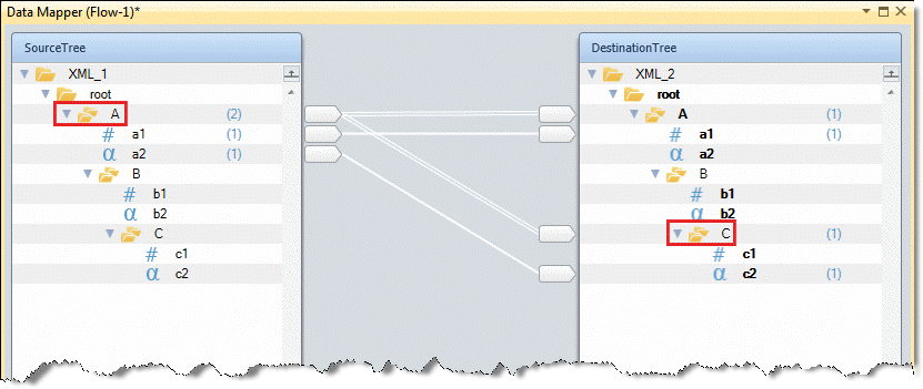 For instance, in the image below, if you delete the connection between the A and C compounds (marked in red), the a2 to c2 connection will not be deleted. This is because there is still a remaining parent compound (A to A).