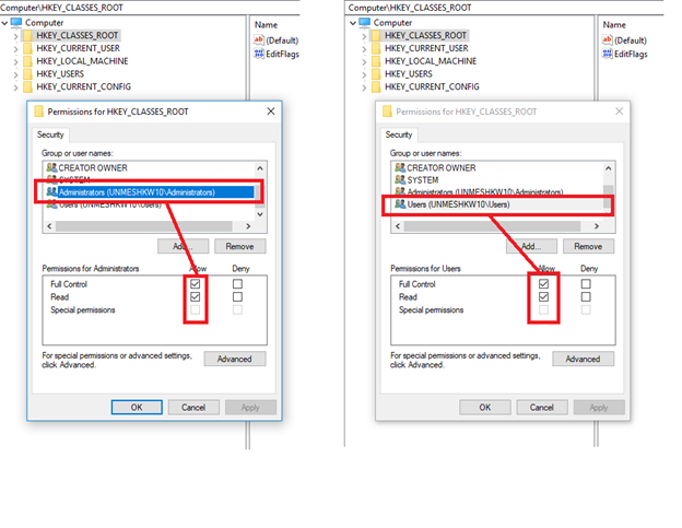 Expand root key HKEY_CLASSES_ROOT and select subkey Service: To give the permissions follow the same steps from c) to g) as above.