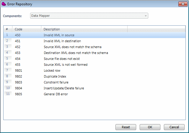 button in the From or To columns, the Error Repository dialog box is displayed. Here, you can see all of the error codes built in to the Magic xpi components. If you develop your own components, you should add the errors to this list.