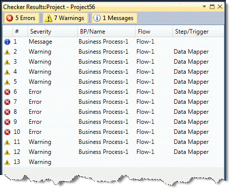 You can also run the checker yourself. It only takes a few seconds to syntax check a Magic xpi project. The Checker tool will find, for example, steps which have not been configured and incompatible types. When the syntax check is completed, you will be presented with a list of errors (if there are any). Clicking on an error will cause you to jump to that error so you can fix it.