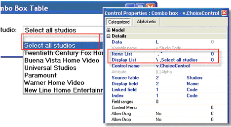 We use the Display List property to add two more items to the list: a blank (specified by adding backslash and a space), and the words “Select all studios”.