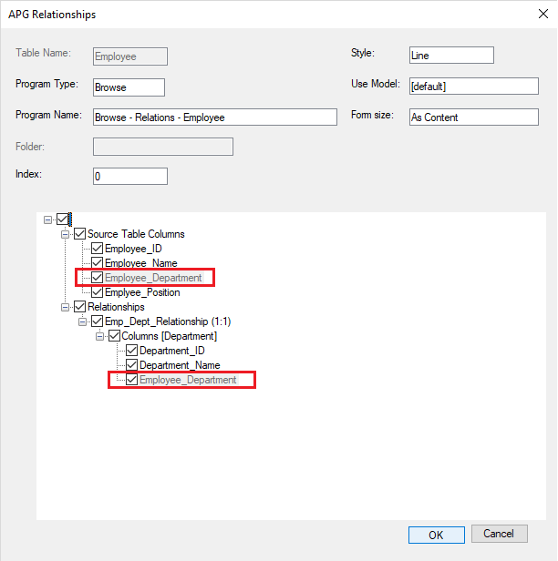 18. Press Ctrl+R for APG with Table Relationships. You are presented with APG Relationships dialog. You can see the relationships in the form of tree structure in collapsed manner. You need to expand the nodes to be able to see Columns, Relationships, and Criteria. Note that Employee_Department is the common column by which Current Table and Referenced Table are linked.