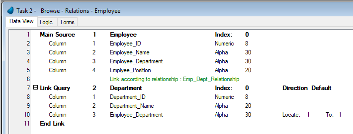 22. Now if you open the program’s Data View, you get to see that a program is generated for Employee Table with a Link Query as shown below.
