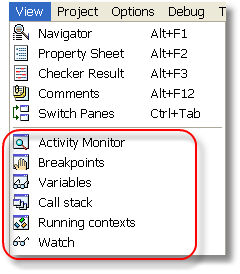 Open up the monitors you want by clicking on the desired item in the View pulldown menu. You can open up the monitors after you have started the debugging process also.