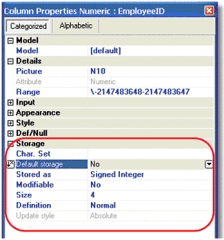 In the Storage section, we see exactly how this field is actually implemented. It is stored as a 4-byte signed integer. The Def/Null and SQL sections give further information about the details of the field implementation. These are summarized below, but you can get more information about any one option in Magic xpa by positioning the cursor on it and pressing F1.