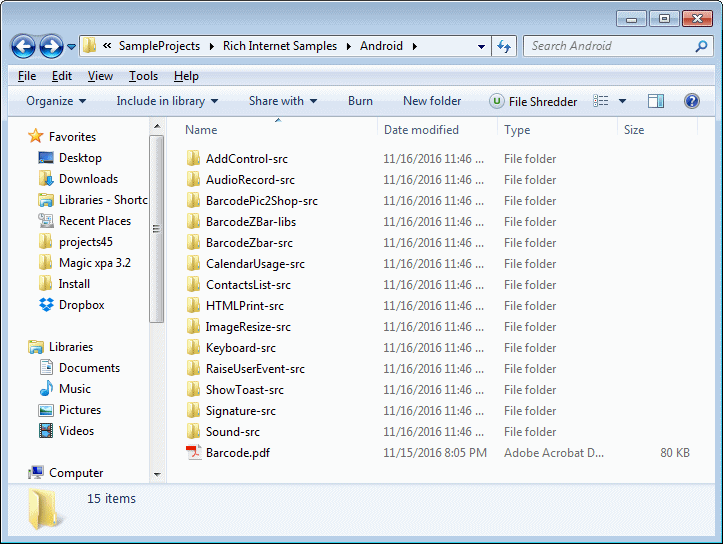 The installation of Magic xpa includes samples of using native OS code. The image below shows you the Android folder where you can find the samples. There is a similar folder for iOS.
