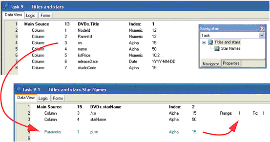 We also create a subtask, which accesses the starName XML view. The index used here is the /sn field, and we use that same field as the parameter, to range the view.