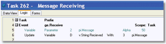 Set up a global event that has the parameters you need to pass between the programs. In our example, we set up an event called “ge.Receive”, that has one parameter, the message we want to send. Note that Wait must be set to No.