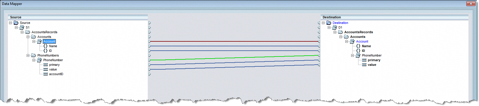 In the Destination pane (as shown below, right), you can see a hierarchical parent-child structure defined by the Accounts1.xsd file. This comprises a parent compound node called Account, which is made up of Name and ID nodes. In addition, there is a child compound node called PhoneNumber, which is made up of primary and value nodes. In this case, the accountID node is unnecessary because the relationship between the accounts and their phone numbers is governed by the structure of the schema.