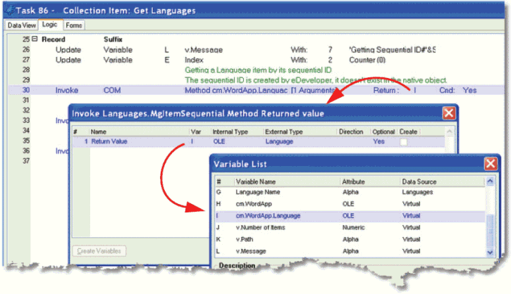 COM objects frequently pass and receive other COM objects as parameters. While this may seem a little odd when you first work with COM objects, it is very easy to do in Magic xpa. Since COM objects are just variables, you pass them as you would any other variable.