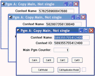 In our example, we have Pgm A, which is called three times. Whether it is called from the menu or from another program, it has a unique ID and runs independently of the other windows.