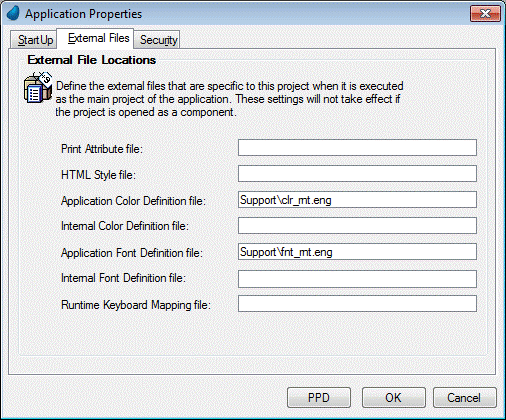 By default, Magic xpa uses the Colors, Fonts, and Keyboard mapping that are installed with Magic xpa. However, you will probably want to customize these features for your particular application. Each application can have its own setup for colors, fonts, and keyboard. Since these are held in text files outside of Magic xpa, they can be changed at runtime and even customized by the user.