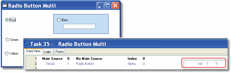 However, you can set the default option quite easily. Remember that a choice control is still a piece of data, and can be initialized like any other piece of data. In this example, the “Red” option (in the Display List property) is associated with ‘1’ (in the Items list property). So we initialize the Radio button virtual to ‘1’ in the Init column.