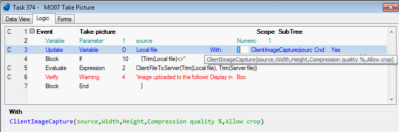 In the With property, define the ClientImageCapture function and in the source parameter (first parameter) use the following value: 0 to open the camera and 1 to open the gallery.