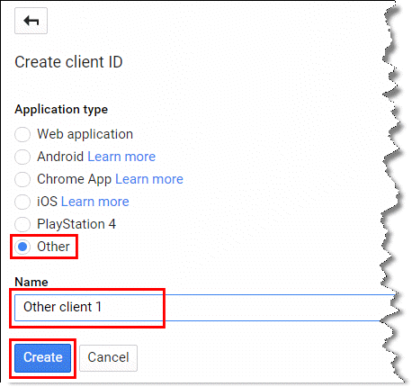 In the Create client ID screen's Application type section, select Other, and enter the required name.